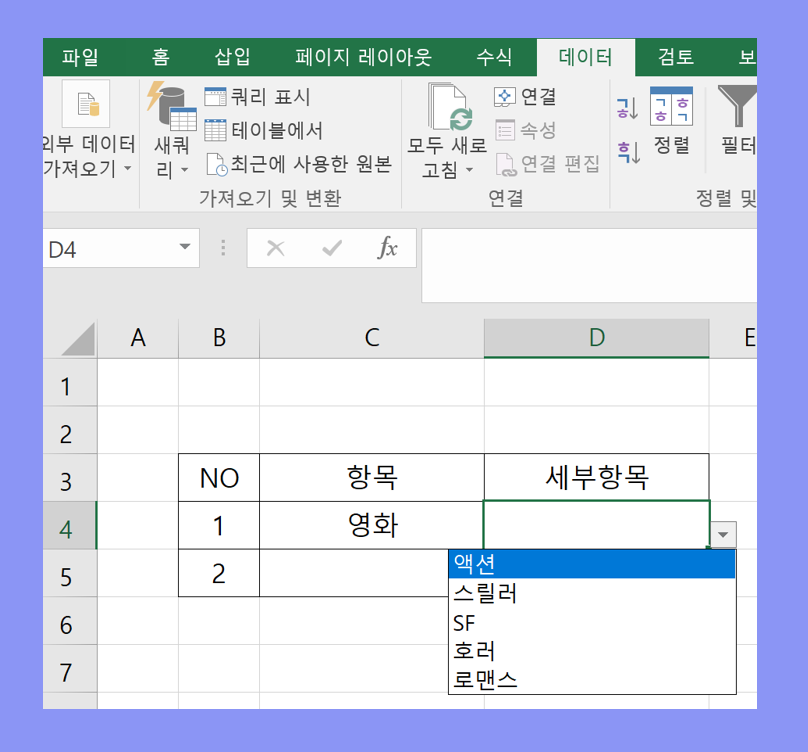 D4 셀을 선택한 뒤에 위의 방법처럼 데이터유효성 을 클릭합니다.