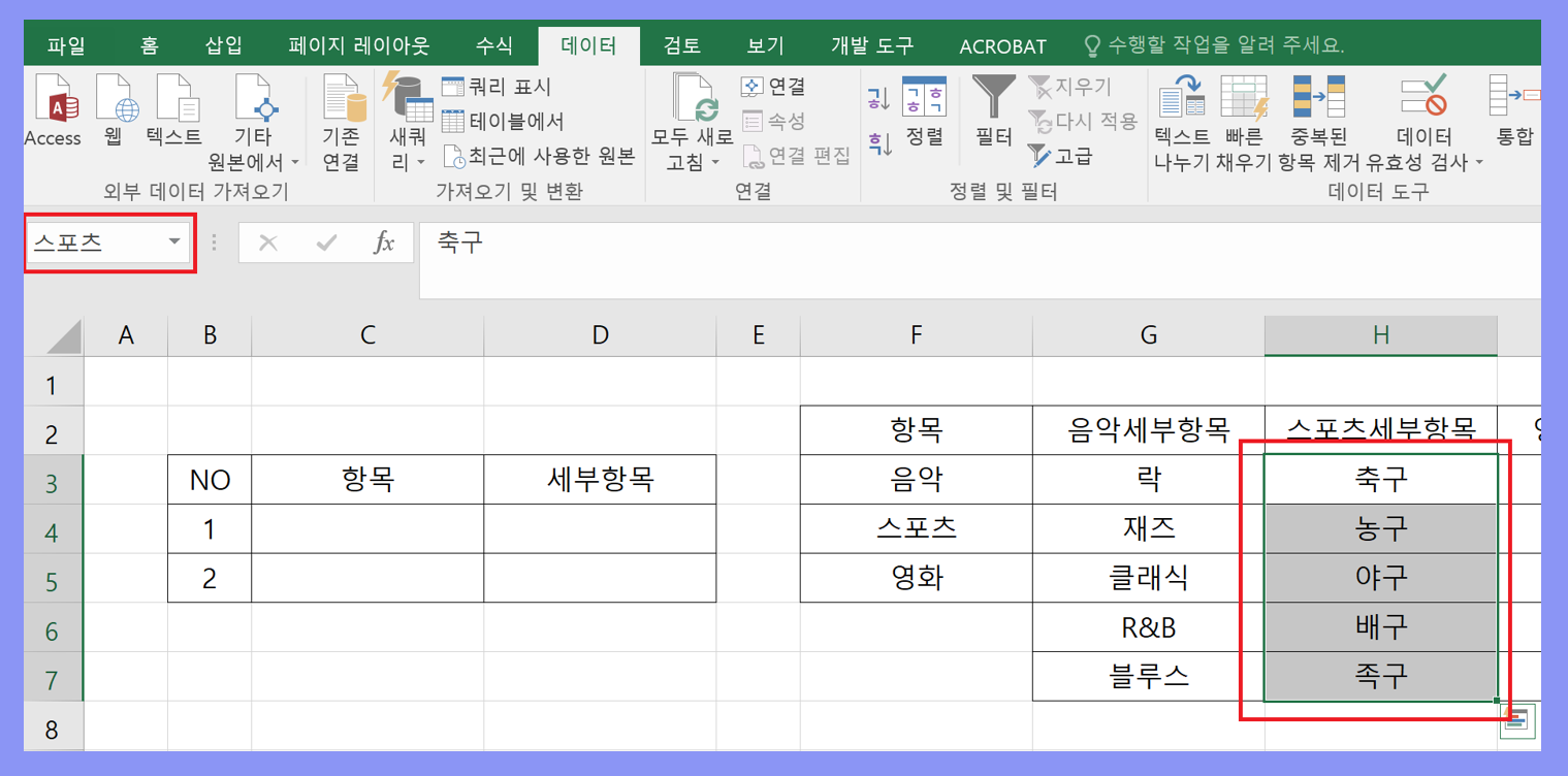 위가 괕은 방법으로 스포츠, 영화 로 지정을 하니다. 상위 항목과 명칭이 같아야 INDIRECT 로 연결이 가능합니다.