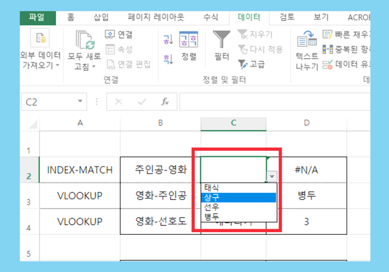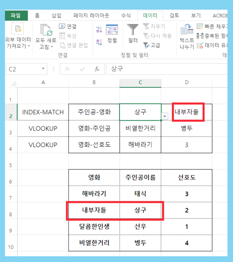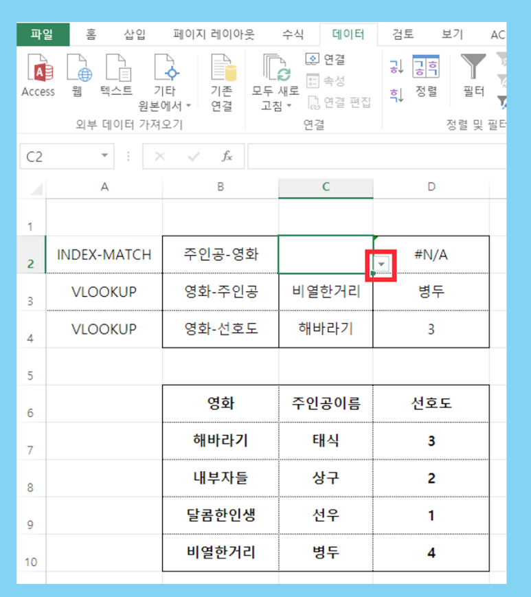 index 함수와 match 함수를 사용하여, C7에서 C10 까지에서 선택한 C2 셀의 주인공 이름의 위치값을 반환하여서 B7에서 B10 까지 결과값을 반환하도록 설정하였습니다.